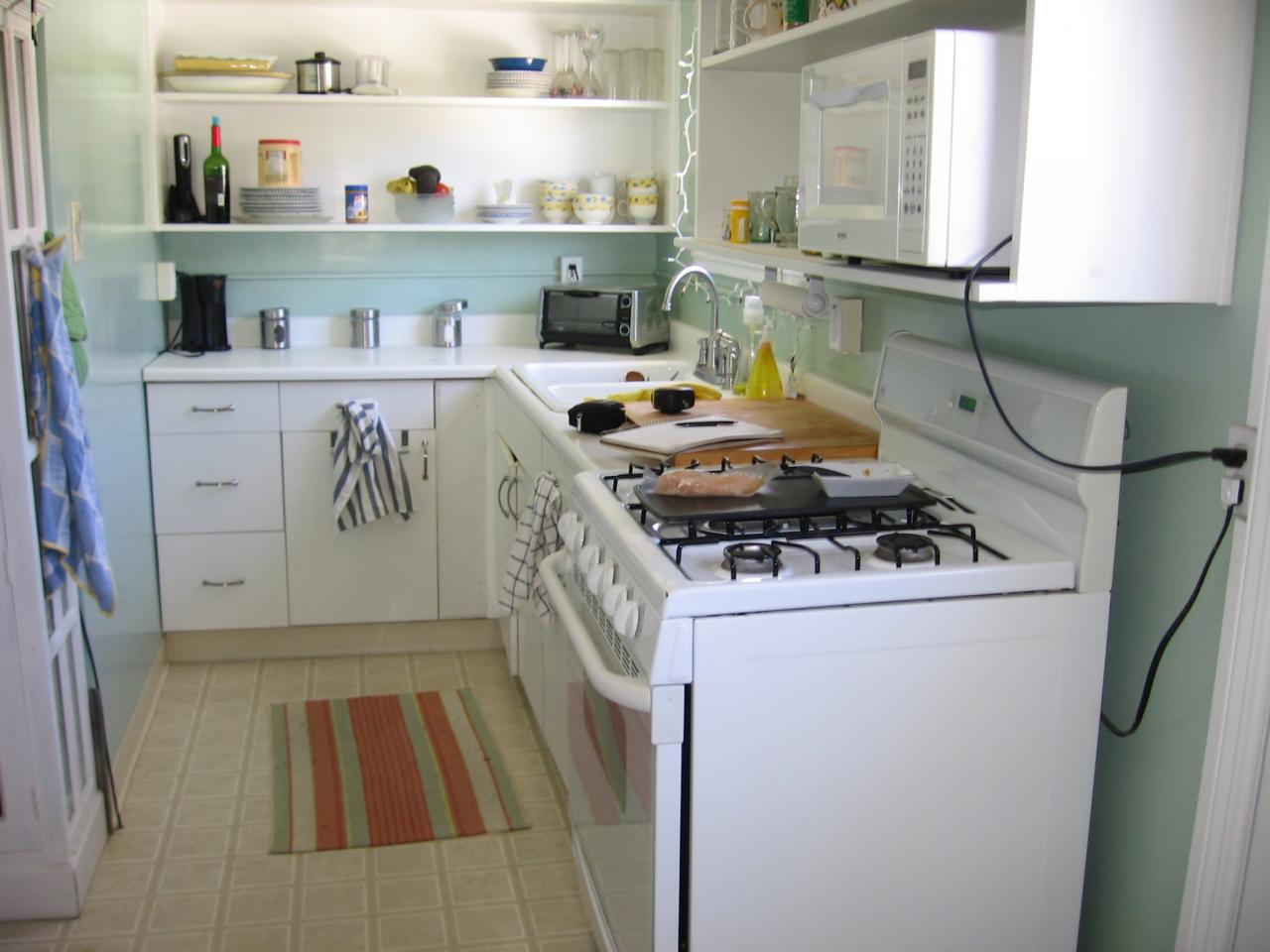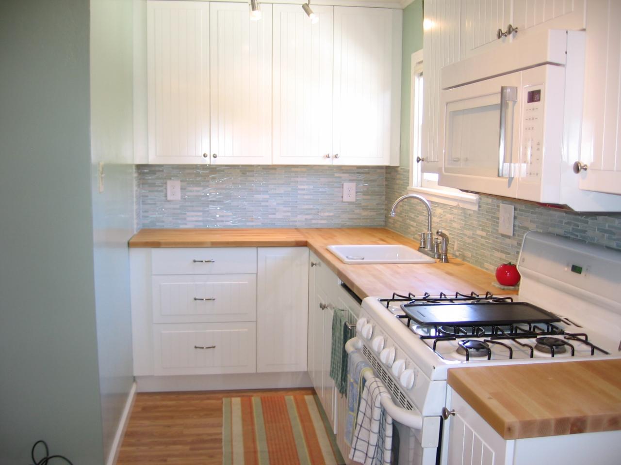The finished work includes new flooring, cabinets, countertop, sink, faucet and backsplash.