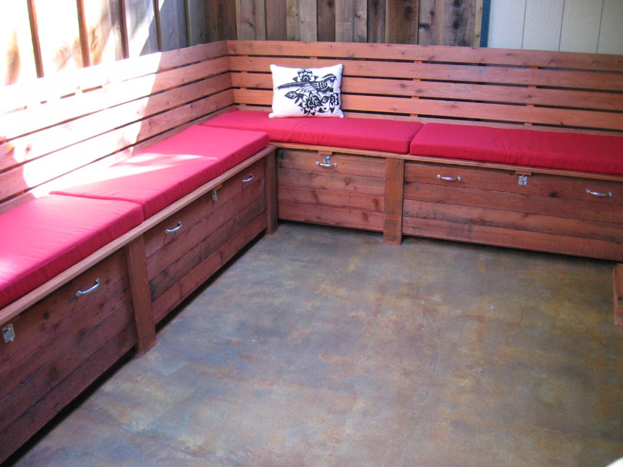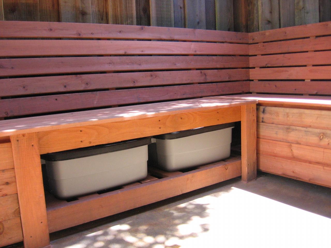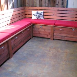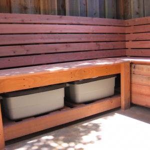 A storage bench that I designed and built. The bench provides about 16 linear feet of seating and holds Rubbermade totes underneath.