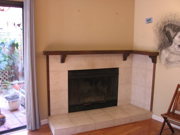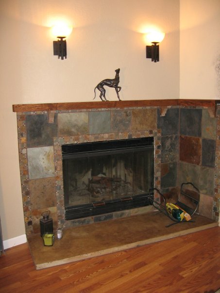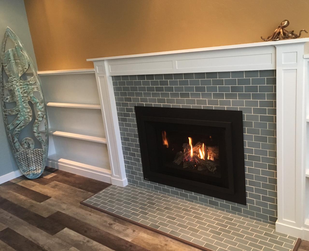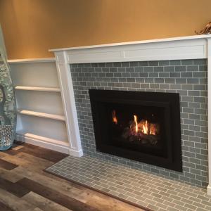 This fireplace received a complete makeover and includes built-in shelving. The new flooring is waterproof luxery vinyl plank. The hearth extension was lowered but the interior of the fireplace was raised up.